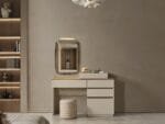 Zamansız hatlara sahip yatak, minimal cam detaylı dolap ve işlevsel şifonyer ile yaşam alanınıza sade bir zarafet kazandırır.